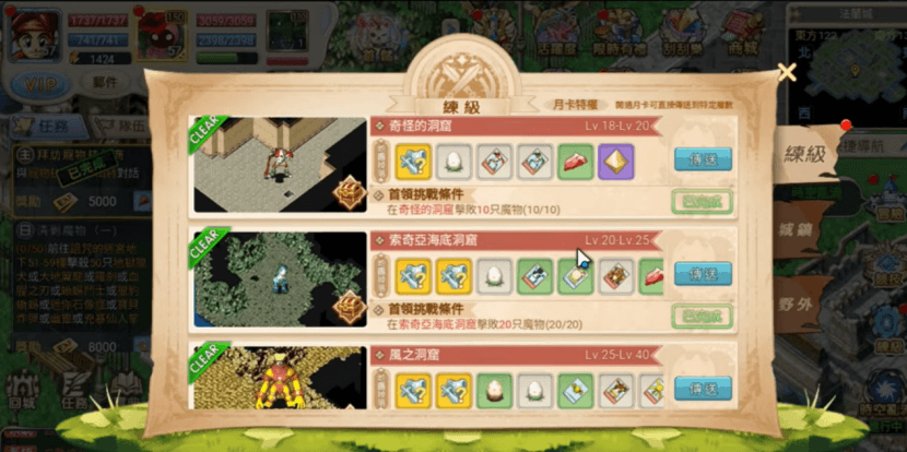 - 練級方面,副本挑戰是獲取養成材料的主要管道。在副本中達成指定條件後,即可挑戰首領BOSS,擊敗後能獲得稀有裝備和寵物養成道具。