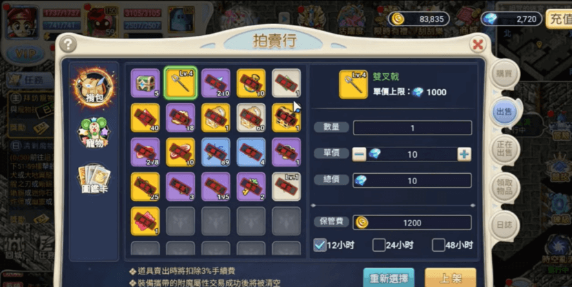 遊戲拍賣行支持玩家自由交易閒置物品,玩家可自行設定價格等待其他玩家購買。需要注意的是,拍賣行物品會收取保管費,保管時間越長費用越高,建議合理定價及時出售。