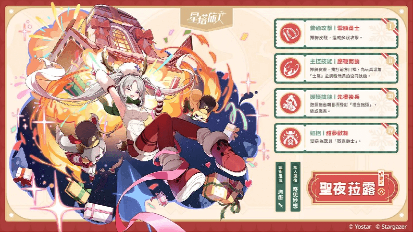 聖夜菈露作為《星塔旅人》雪願節限定5星火屬性均衡角色,以獨特的玩具協同作戰機制和雙向適配的定位脫穎而出,既能擔任主控輸出,也可作為強力援護輔助隊伍。本文將從角色定位、技能解析、養成策略、陣容搭配四大核心維度,為玩家打造實用攻略,助力輕鬆駕馭這位聖夜使者。